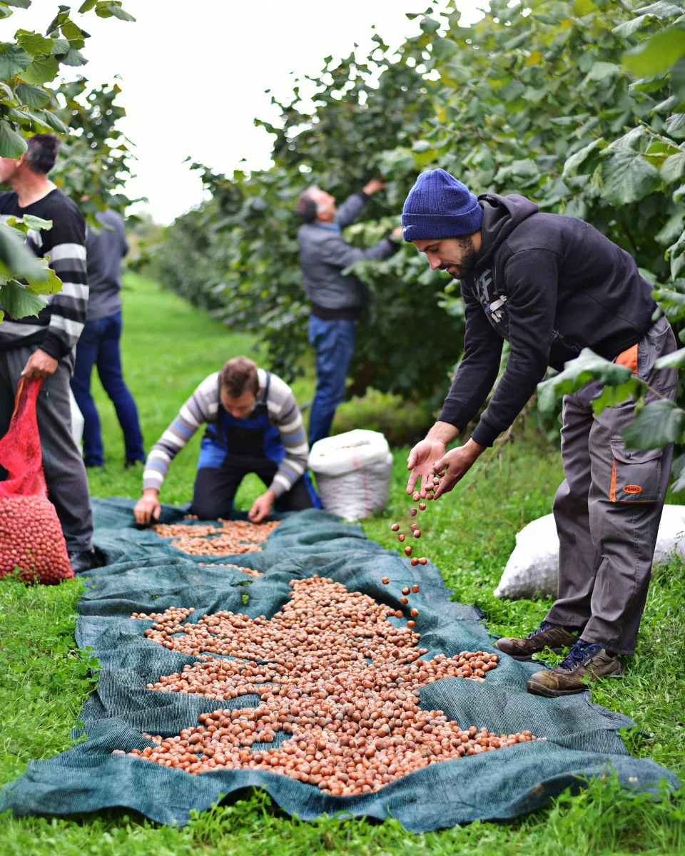 Unsere Haselnuss-Bauern haben sich in der Kooperative EkoLešnik zusammengeschlossen und kultivieren Bio-Haselnüsse auf höchstem Niveau. Sie experimentieren mit heimischen und italienischen Sorten – für Kenner den besten Sorten der Welt. Sorgsam verarbeitet und verpackt werden die Haselnüsse im Familienbetrieb Nelkoski Organik: Nach der Ernte im August und September werden sie in luftdurchlässigen Säcken hängend getrocknet. Erst bei Bedarf nach frühestens 30 bis 45 Tagen werden sie nach Größe sortiert, maschinell entkernt und händisch ausgelesen.